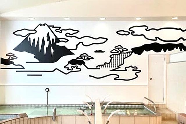 浴室は白黒を基調としたモダンな、迫力あるグラフィックの富士がお出迎え。銭湯ランナーにも人気で、手ぶらでもふらっと立ち寄れるようにレンタルタオル他アメニティも充実。季節合わせたドリンクも多数勢ぞろい。お買い物ついでに訪れてみてはいかがでしょうか。